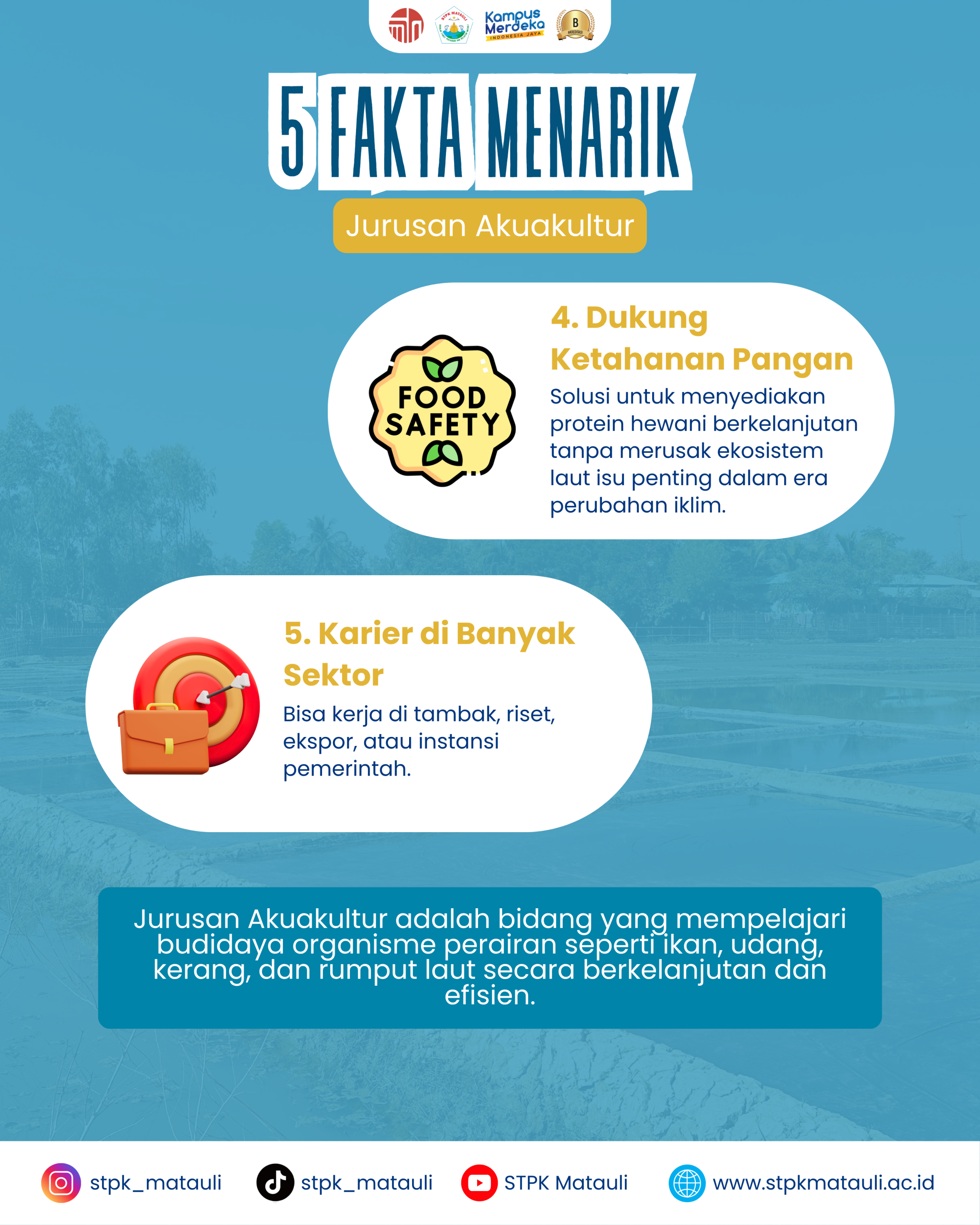 Program Studi Akuakultur STPK Matauli hadir untuk memenuhi kebutuhan tenaga ahli di bidang budidaya perikanan guna mendukung permintaan ikan segar yang terus meningkat. Dengan fokus pada inovasi dan keberlanjutan, mahasiswa dibekali keterampilan dalam: